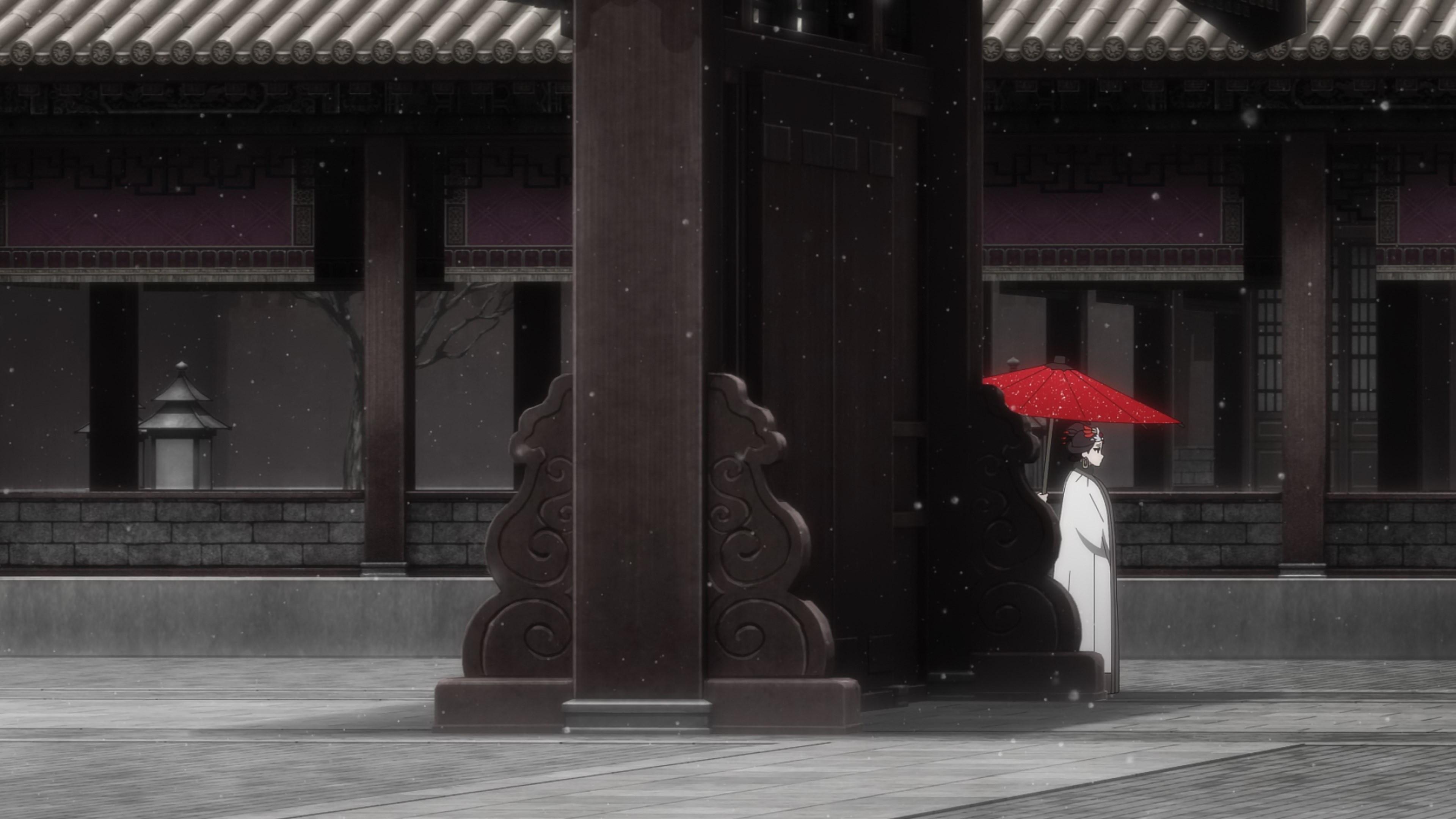 As the desired answer finally comes out of her mouth, the feeling that pieces are slowly falling into place exactly how he didn’t want them to is beautifully portrayed by the absence of sound (and, for that matter, of people in the background, as both Maomao and Jinshi are now completely alone, detached from the blurred-out background) and the last, unsettling shot with its very expressive use of negative space to end the episode.