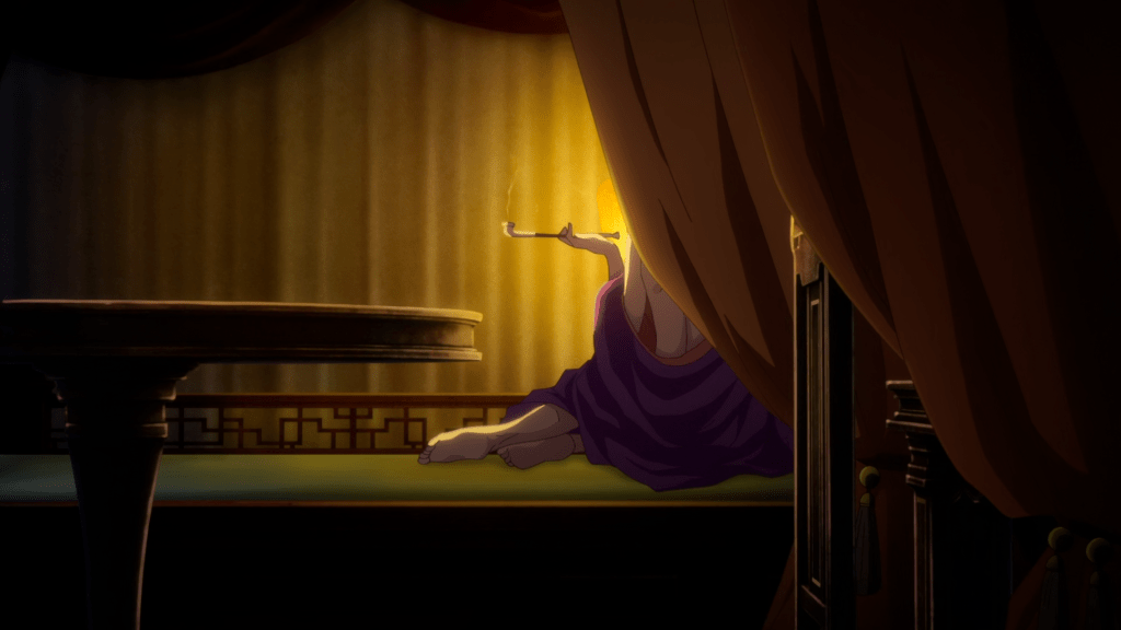 As Miss Maomao and servant Jishi walk out of the Imperial Court together, the episodes goes on with some amusing dialogues and character interactions (it was pretty funny to see Jinshi all excited to play a role opposite to his usual one) until we ultimately reach the Red Light District. This is where things start to regain their intensity, as Jinshi starts to ask his highly unpleasant questions for someone who’s lived most of her life in a renowned brothel, Maomao‘s demeanor changes completely (followed by a close up shot of her sharp eyes, for the first time throughout this episode), and so does the lightning of the scene, since we’re now almost past twilight.