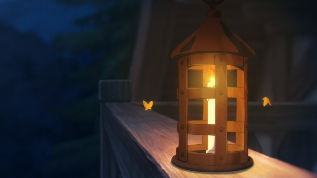 A specific scene of this episode, where Stark and Fern have a brief chat to clear up the First Class Mage’s doubts on the Warrior’s attachment the the party, represents a remarkably well executed example of this theme. Combined with a striking tonal contrast of warm and cold tints intrinsically creating distance between the two of them, the use contrasting but very much parallel shots of the same object—the lantern—perfectly mirrors the narrative of them finding a renewed alignment, by at first placing the prop disproportionately to the right side of the frame, and later exactly at its center.