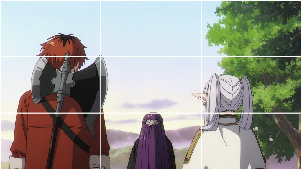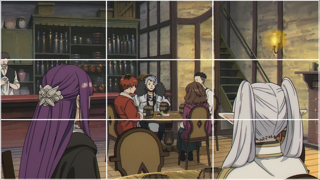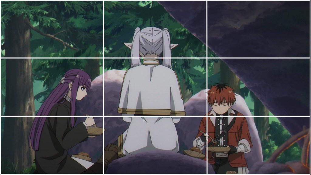 While also offering cues about the depth of the shot, this precisely three by three sectioning of the screen works almost too perfectly as a visual blueprint to frame Frieren, Fern and Stark as they leisurely find their own space within the party.