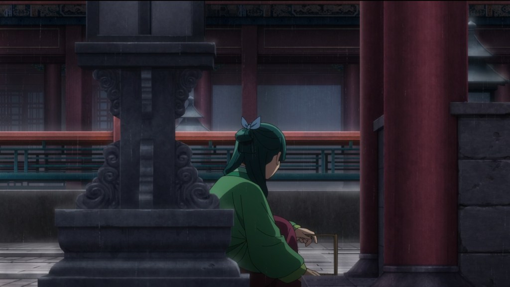 The episode is then brought to an end with Jinshi notifying Maomao that a certain someone is interested in seeing her, and the delivery of her reaction to this irksome news is unsettling to say the least: a great and well-thought use of time, paired with the striking contrast between a very open and two very close-up shots of Maomao makes us jolt as much as Jinshi. There’s no need for words at all for him to understand her answer to that invitation.