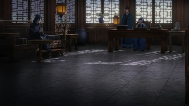 It’s in this moment that Lakan makes his (unpleasant) appearance once again in Jinshi‘s office, and the sense of oppression and uneasiness that his presence brings along is, once again, visually conveyed via low-angled shots.