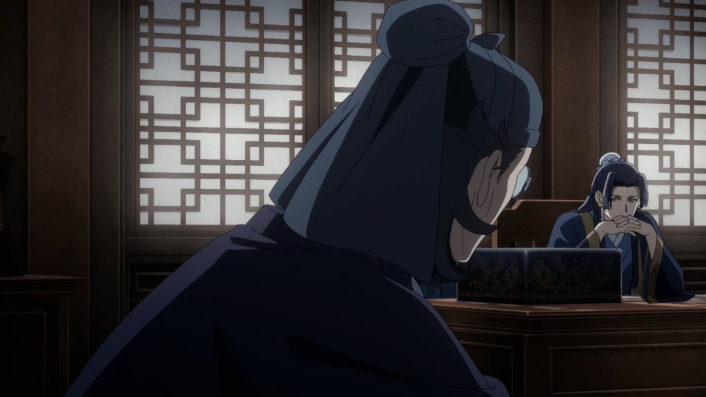 We’re now back in the Outer Palace, where the plot starts moving again, in the form of our main characters’s thinking about each other, Maomao with her inner monologue – truly the “Kusuriya no Hitorigoto” – and Jinshi, with his exchange with Gaoshun, all connected by nothing other than the mysteries surrounding the maidservant’s (adoptive) father.